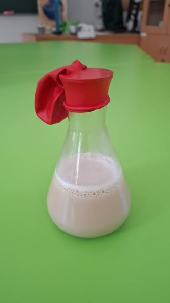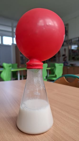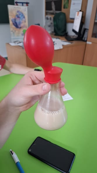 Na lekcji biologii uczniowie sprawdzili, jak drożdże „oddychają” bez tlenu. W kolbie powstał CO₂, który nadmuchał balonik! To właśnie fermentacja – proces, dzięki któremu rośnie ciasto i powstają bąbelki w napojach. Takie doświadczenia pokazują, że nauka to nie tylko teoria z podręcznika, ale prawdziwe odkrywanie świata przez działanie.