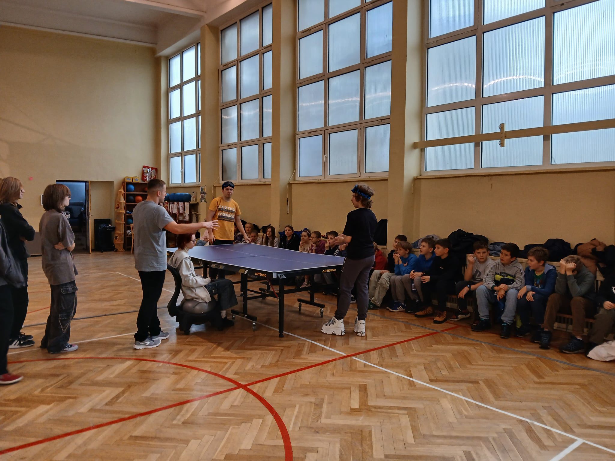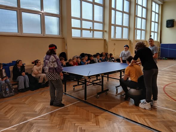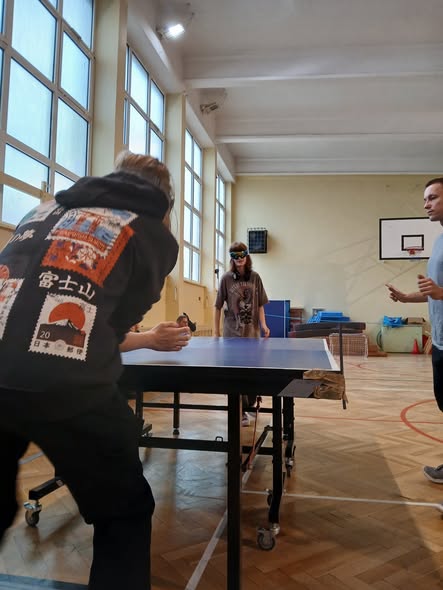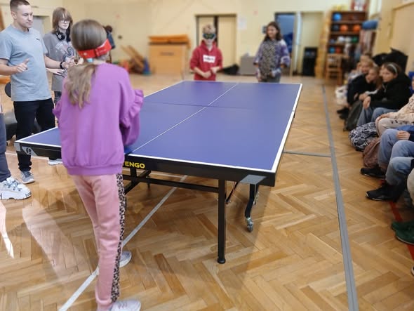 Nasi goście pod czujnym okiem nauczyciela i naszych graczy w tenisa dźwiękowego mogli spróbować swoich możliwości w tym trudnym sporcie.