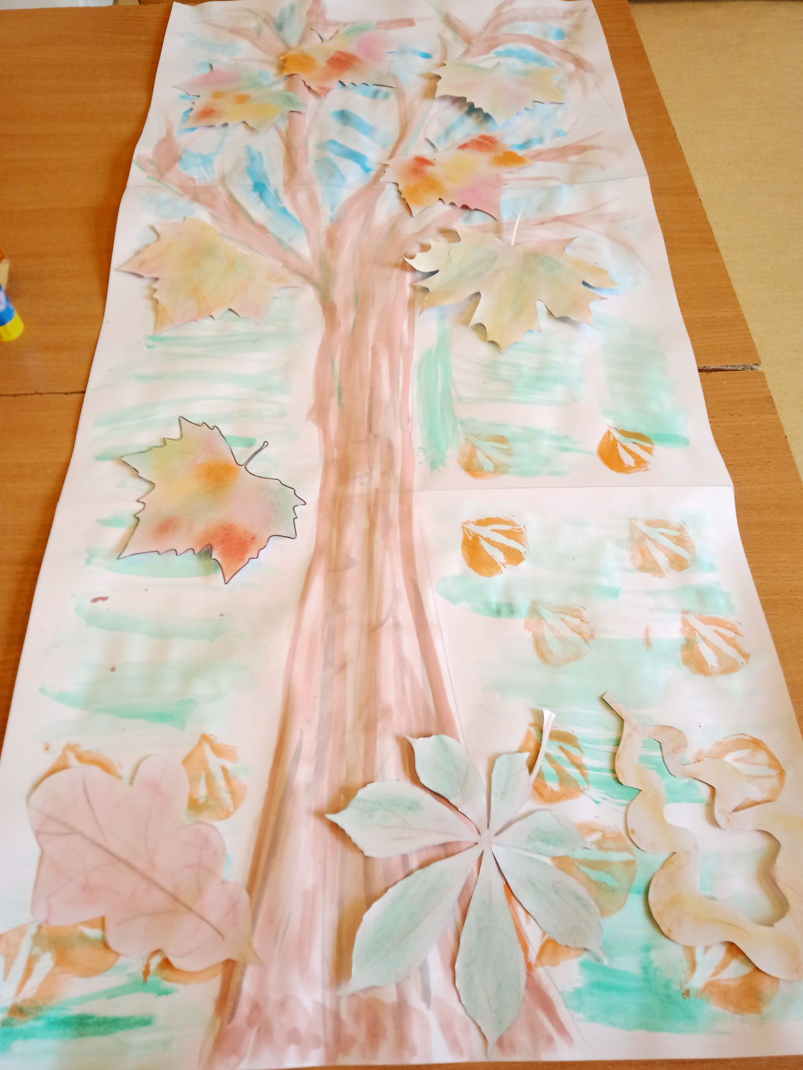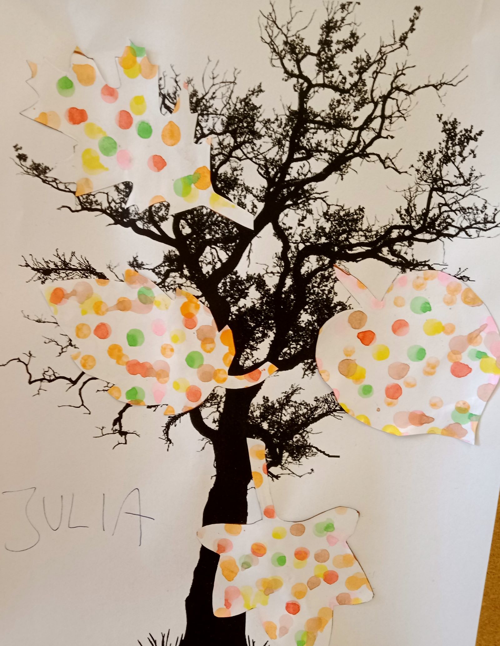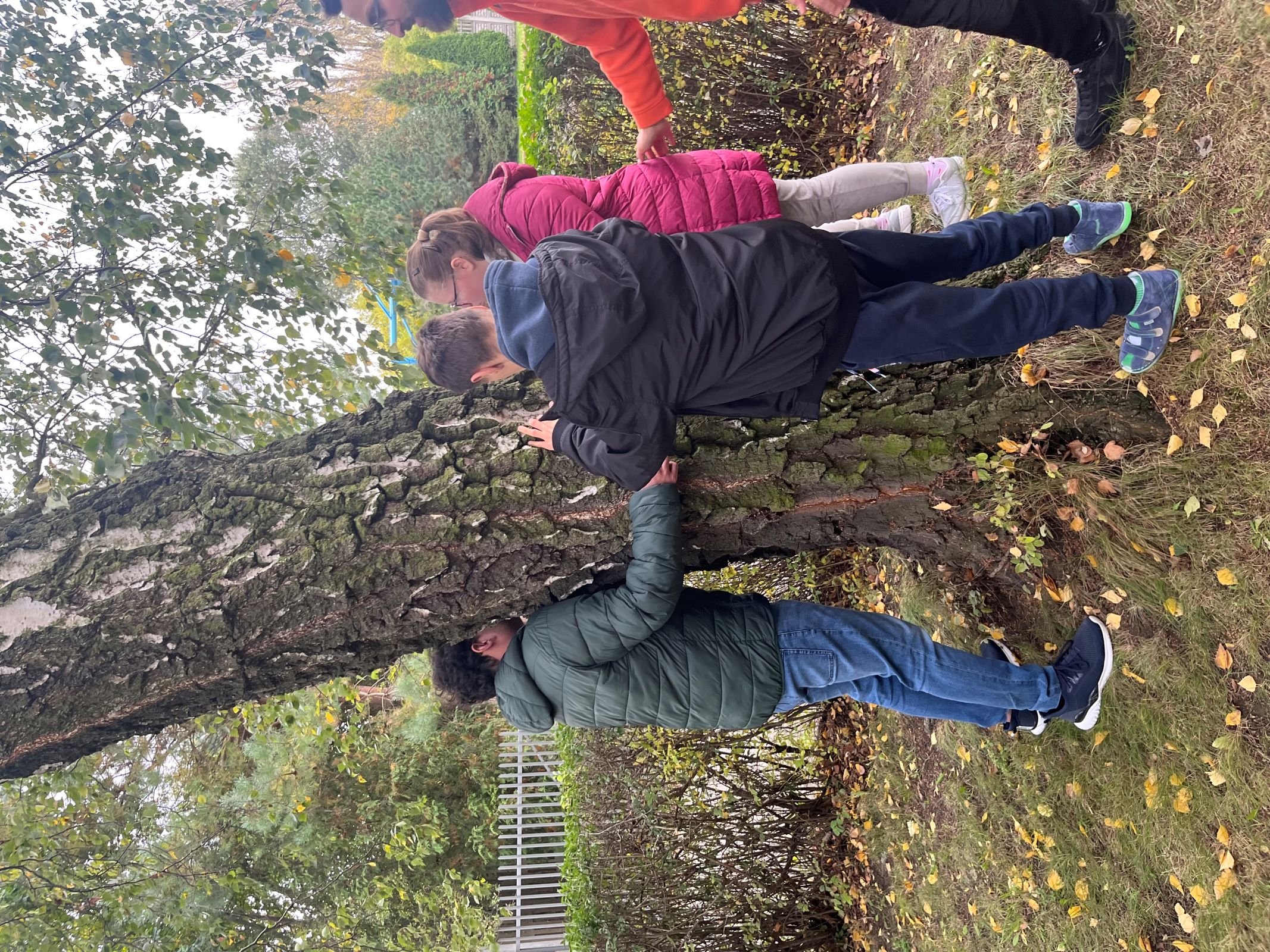 Na koniec zajęć stworzyli wspólną pracę plastyczną "Jesienne drzewo". Dzień zakończyli wspólnym spacerem do lasu, podczas którego czerpali energię przytulając się do brzóz.