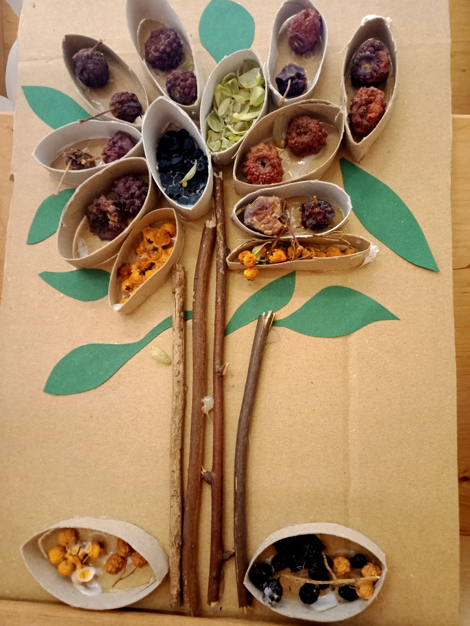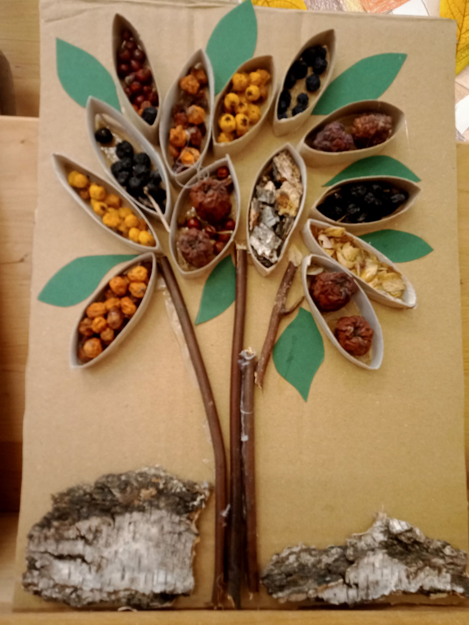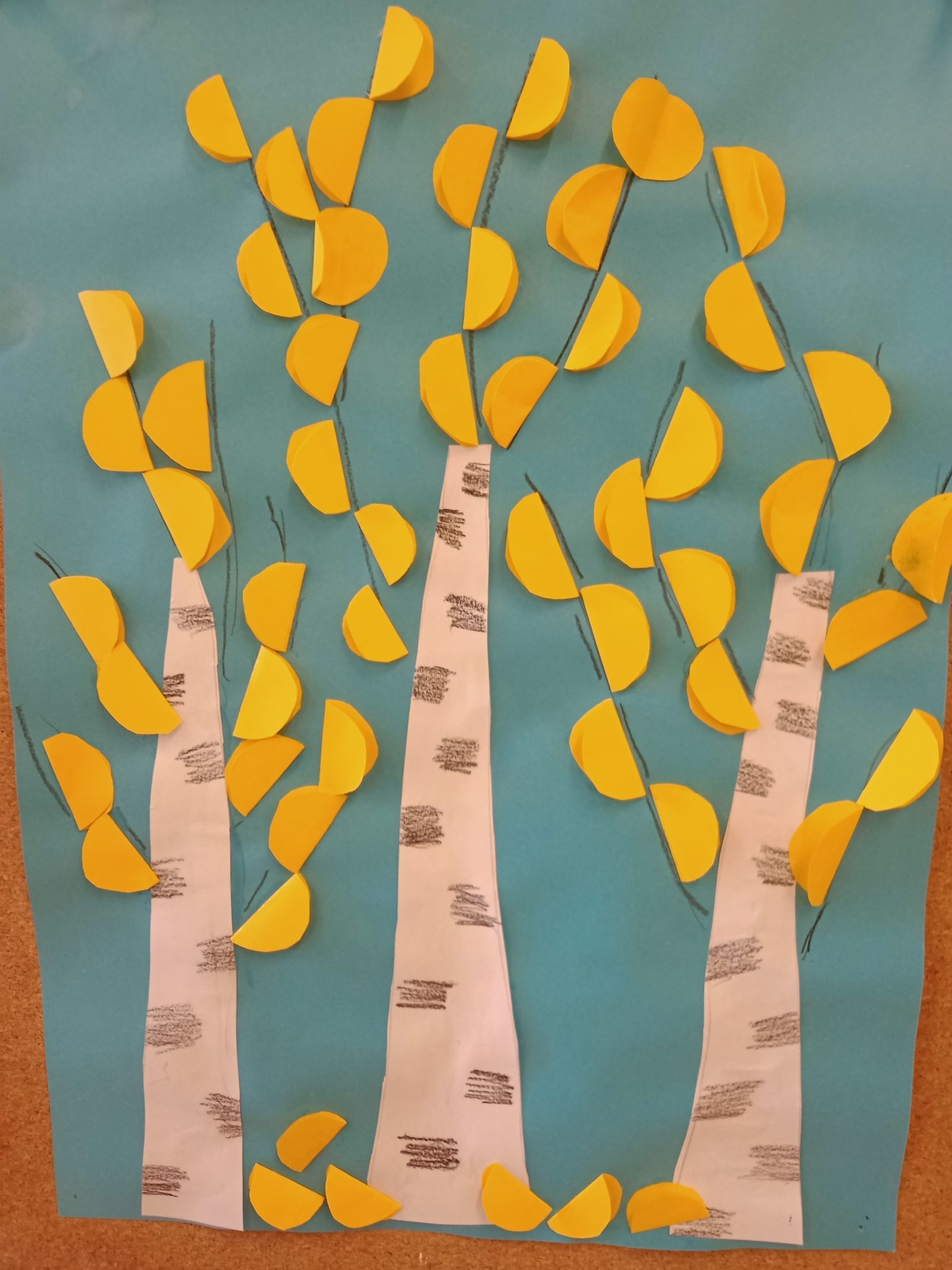 Na koniec zajęć stworzyli wspólną pracę plastyczną "Jesienne drzewo". Dzień zakończyli wspólnym spacerem do lasu, podczas którego czerpali energię przytulając się do brzóz.