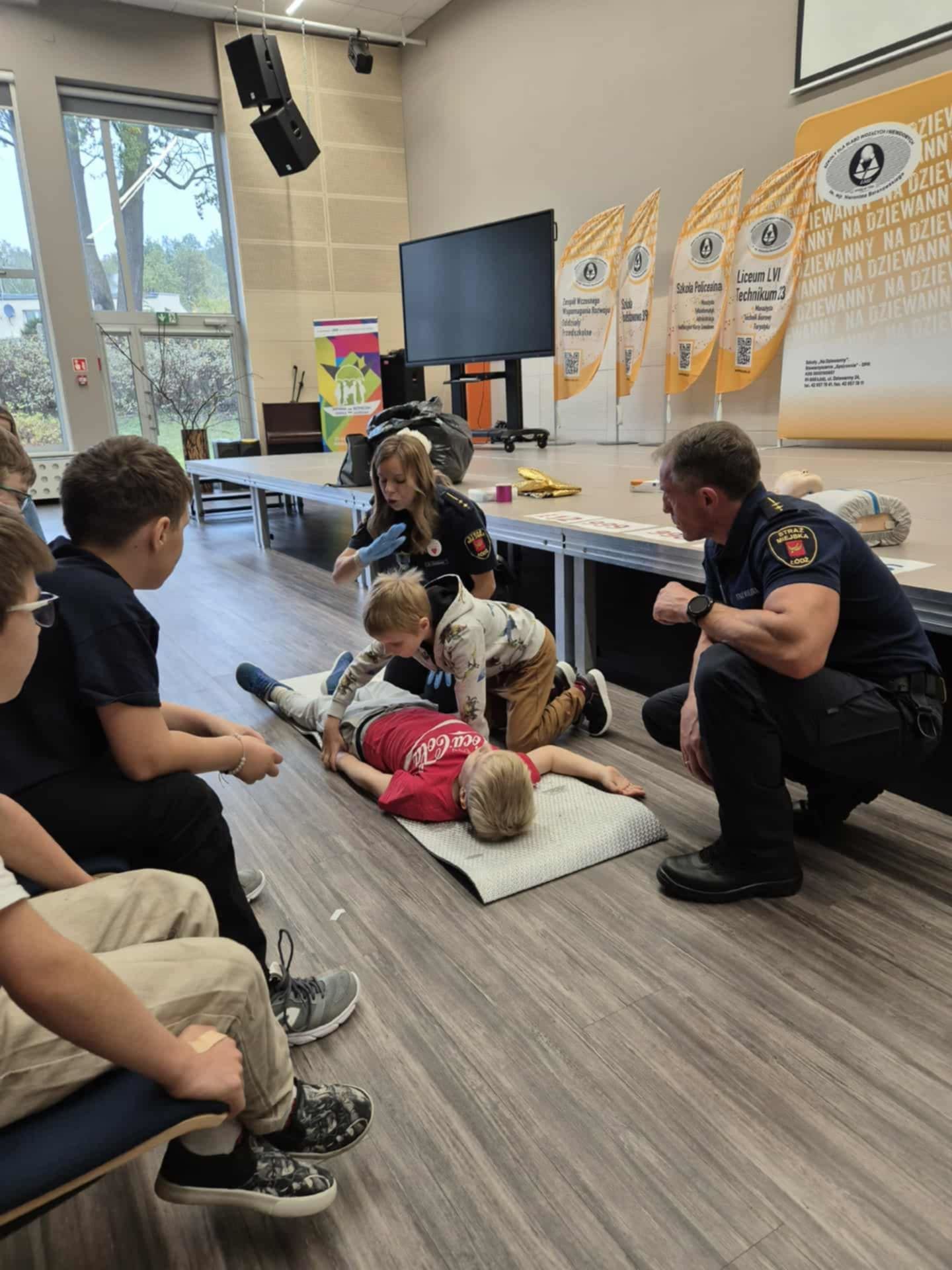 Uczniowie szkoły podstawowej uczestniczyli w warsztatach z pierwszej pomocy przedmedycznej prowadzonych przez przedstawicieli Straży Miejskiej. Dzieci utrwaliły znajomość numerów alarmowych, przećwiczyły ułożenie osoby w pozycji bocznej bezpiecznej, a także zobaczyły jak prowadzi się resuscytację.